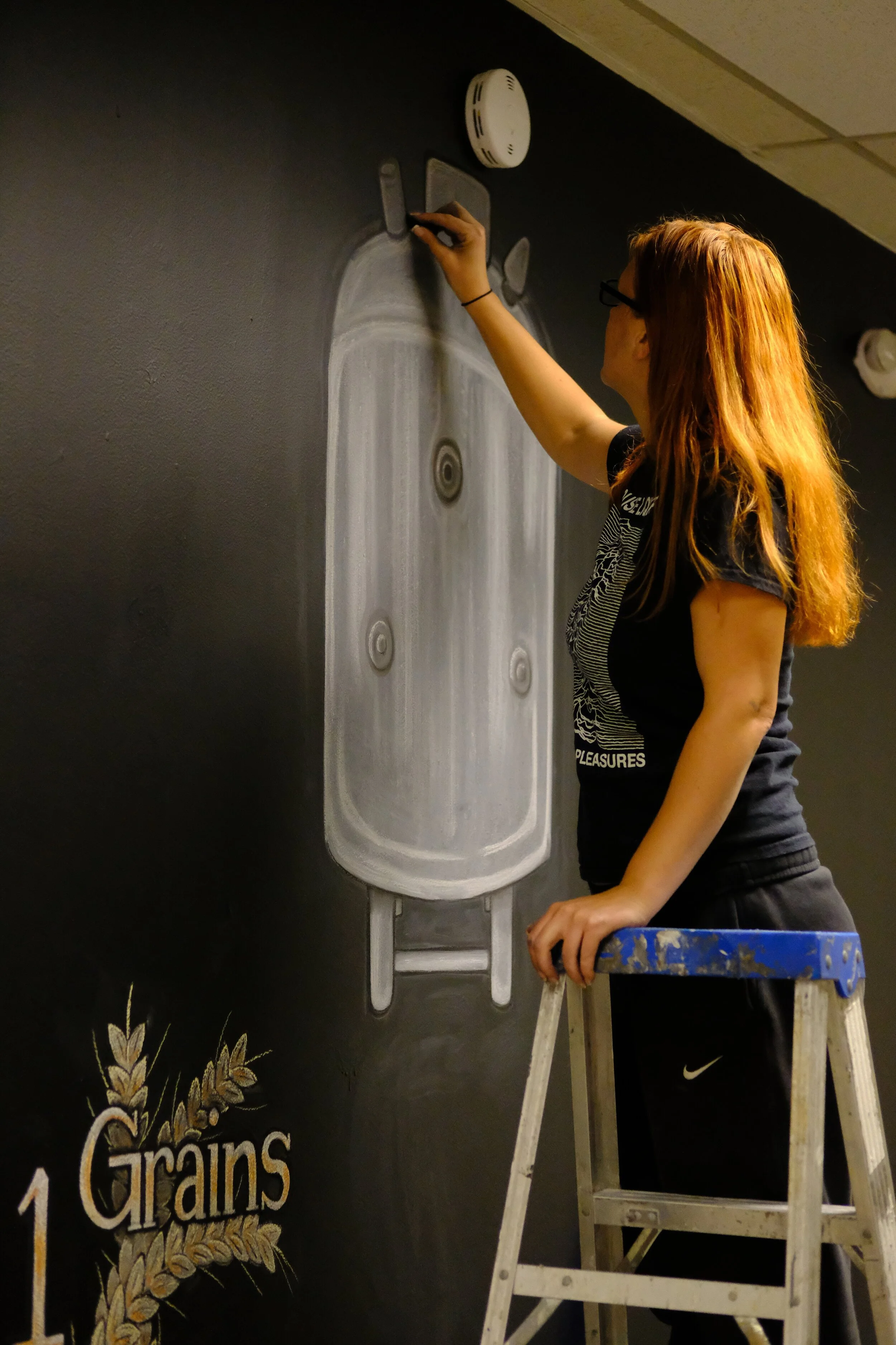 Shmidt Spirits and Inkwell Whiskey are dreams brought to life, and that act of creation is only possible because we know and support so many other dreamers. One of the first people we ever drafted into helping us turn a wild idea into a concrete reality was Baltimore-based artist Brittany Herbinko. A friend of Master Distiller Brian J. Roan’s since they were in college, when Arthur expressed his vision of a chalk mural in the tasting room, there was no one else Brian thought of turning to for help. Arthur had been expecting a simple schematic line drawing, and when he saw the level of detail and artistry Brittany brought to the finished product, he was stunned.