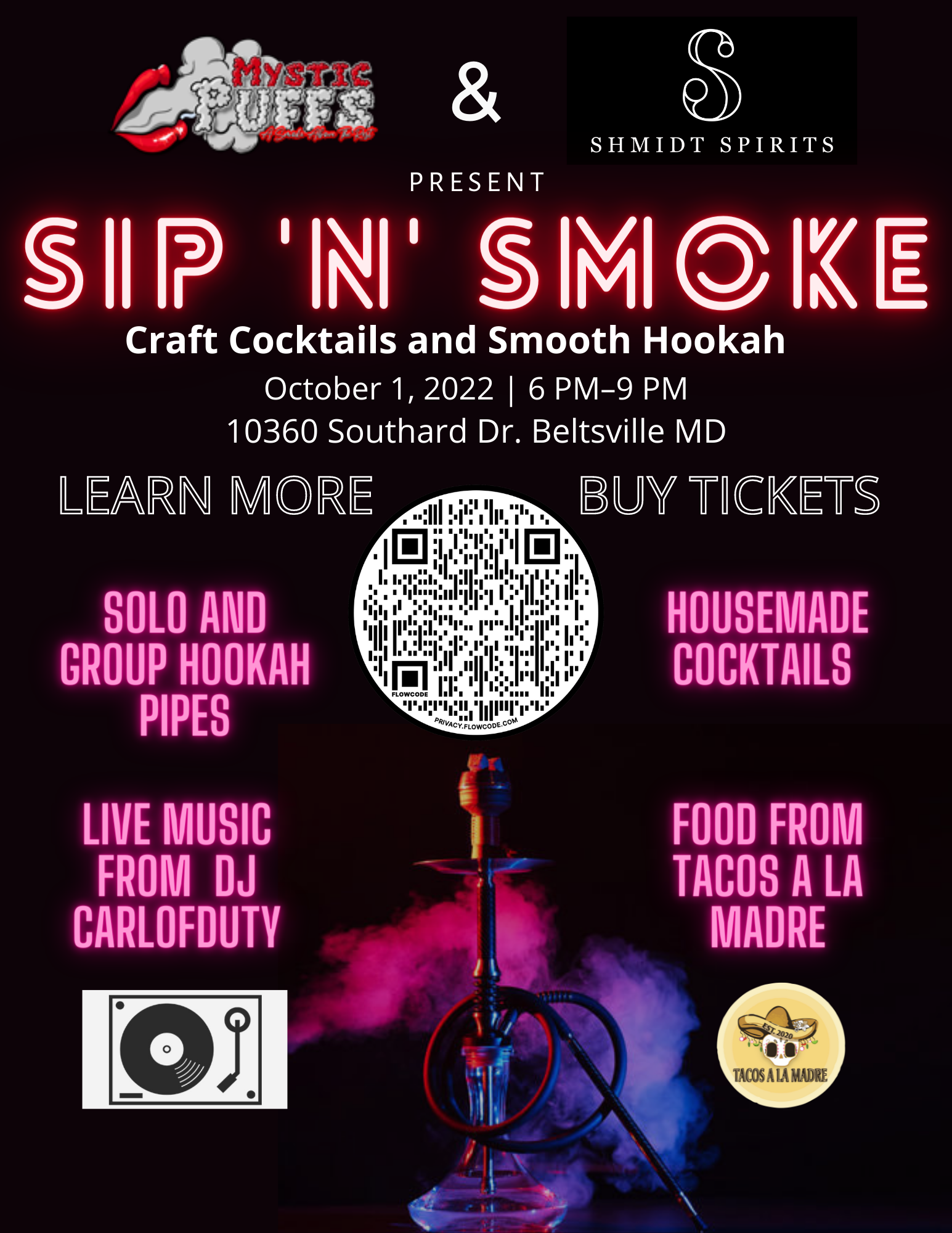 Sip 'n' Smoke Saturday, October 1, 2022 6:00 PM 9:00 PM 18:00 21:00 Shmidt Spirits 10360 Southard Drive Beltsville, MD, 20705 United States (map) Google Calendar ICS Join us for an evening of hookah and cocktails. Learn more